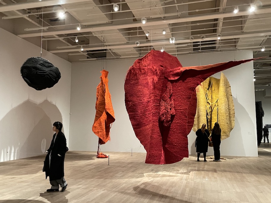 הדרך חזרה לטקסטיל התרחשה בשני העשורים האחרונים, בהם חל טשטוש גבולות בין דיסציפלינות יצירתיות, שבמשך דורות שמרו על הפרדה והיררכיה ברורים. התנאים היום מאפשרים להעריך מחדש יצירות בטכניקות שפעם נחשבו לקישוט בלבד. אני ממש זוכרת את הפתעתי בביאנלה בוונציה ב– 2017, כשנתקלתי בערימה עצומה של חבילות חוטים צבעוניים, של האמנית האמריקאית שילה היקס (ילידת 1934). בביאנלה ב– 2022 היו עבודות רבות שעסקו בטקסטיל, כמו של איגשאן אדמס וטאו לואיס וססיליה ויקוניה. כנ״ל בביאנלה האחרונה – פסיטה אבאד, לדוגמה, שבמקביל היתה לה תערוכת יחיד במומה PS1. קצרה היריעה מלציין את כל התערוכות והאמנים החשובים אבל אולי אזכיר גם את התערוכה המופלאה של האמנית הפולניה מגדלנה אבקנוביץ׳ (1930-2017), שזכיתי לראות בטייט מודרן בלונדון. אבקנוביץ׳ היתה בין אותן אמניות פמיניסטיות שעסקה בטקסטיל כבר בשנות הששים. בימים אלו מוצגת תערוכה של האמנית הקולומביאנית בת ה- 92 אולגה דה-אמרל בפונסדיון קרטייה בפאריז. מוצגות בה 80 עבודות משנות הששים ועד היום.