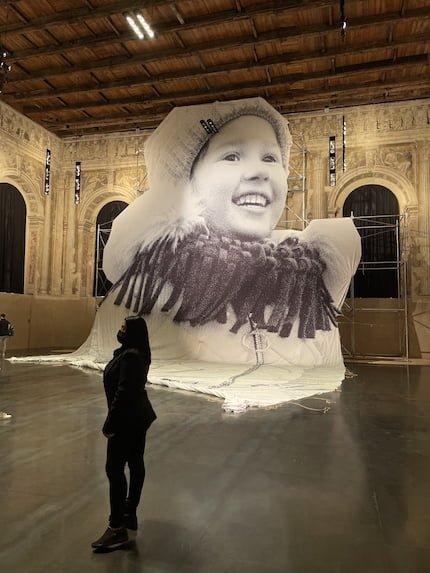 עוד אמן שהגיע לאוקראינה היא הצלם הרחוב הצרפתי ג׳יי אר. עם תחילת המלחמה, הגיע אליו צילום של ולריה – ילדה בת חמש שנאלצה לברוח מביתה ולהפוך לפליטה. הסיפור של ולריה נגע מאד לליבו של ג׳יי אר והוא הדפיס את תמונתה על בד ענק באורך 45 מטרים. מתנדבים סייעו לו להגיע עם הבד המגולגל לעיר לבוב, שם חיכו לו 100 ממתנדבים, שפרשו את הבד בכיכר העיר. המטרה היתה שטייסים רוסים שיעברו מעל העיר יראו את החיך של הילדה הקטנה ואולי זה יגרום להם לחזור לרוסיה מבלי להטיל פצצות. מאז הוא הציג את ולריה בערים שונות באירופה, כשהיא נישאת בתהלוכות שהגיעו גם לוותיקן. לקראת תחילת הביאנלה, ג׳יי אר הגיע לוונציה ופרש שוב את העבודה. משם היא הועברה לאחד מבנייני הציבור החשובים בוונציה – הסקואלה גרנדה מיזריקורדריה, שהושכר על ידי האוליגרך האוקראיני (היהודי) ויקטור פינצ׳וק. בחודשים הראשונים של הביאנלה הוצגה במקום תערוכת תמיכה באוקראינה. התערוכה המרגשת (אליה לקחתי את כל הקבוצות שסיירו איתי בביאנלה) הציגה גם אמנים אוקראיינים וגם אמנים בינלאומיים כמו מרינה אברמוביץ׳, דמיאן הירסט, אולאפור אליאסון, טקאשי מורקמי וכמובן, ג׳יי אר. מפאת גודלה, רק החלק העליות של ולריה היה גלוי וכל שאר הבד היה מקופל על הרצפה.
