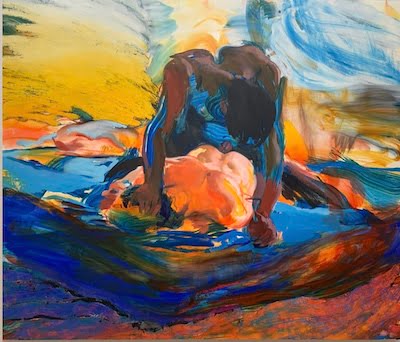 אמן נהדר נוסף שהכרתי באופן אישי השבוע היה דורון לנגברג, אמן ישראלי שגם עליו אין לי ספק שעוד נשמע רבות. לנגברג (יליד המושבה יוקנעם, 1985, גר ועובד בניו יורק), נחשב היום לאחד הקולות הבולטים בדור הצעיר של הציור הפיגורטיבי. העבודות שלו מתאפיינות בצבעוניות עזה וזוהרת ובסוג של מזיגה אירוטית בין גופים אמורפיים המזוהים רק באופן חלקי ומרומז. בציוריו נרקמים מערכות יחסים בין דיוקנאות שלו, של בני משפחתו וחבריו, כשהם חוגגים את הפיזיות של המגע בחושניות ובמיניות קווירית אינטימית ועזת הבעה. הוא מציג גוף עבודות יפהפה במוזיאון רובל ובמקביל הציג תערוכת יחיד ביריד המרכזי, בביתן של גלריה ויקטוריה מירו המייצגת אותו. למותר לציין שכל העבודות נמכרו כבר ביום הראשון.