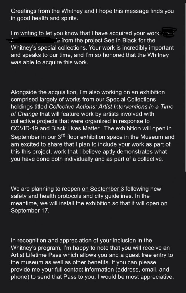 המוזיאון ביטל תערוכה שאמורה היתה להיפתח באמצע ספטמבר, העוסקת באמנות אקטיביסטית בתקופת הקורונה. מספר עבודות של אמנים שחורים שהיו מיועדות לתערוכה, נרכשו לאחרונה על ידי הוויטני ממכירות פומביות שהכנסותיהן נועדו לשמש למטרות צדקה. זהו סוג מאד מסוים של מכירות פומביות, בהן העבודות נתרמות על ידי האמנים או נמסרות תמורת מחיר סמלי, הנמוך באופן משמעותי ממחיר השוק של אותם אמנים. במקרה זה, מדובר על כמה אמנים שתרמו עובודת תמורת 100 דולר מתוך מחשבה שהעבודות תימכרנה לאנשים שידם אינה משגת לשלם מחירים גבוהים. אי אפשר היה לשער שגם מוזיאון כמו הוויטני ינצל מכירה מסוג זה כדי לרכוש עבודות בזול.