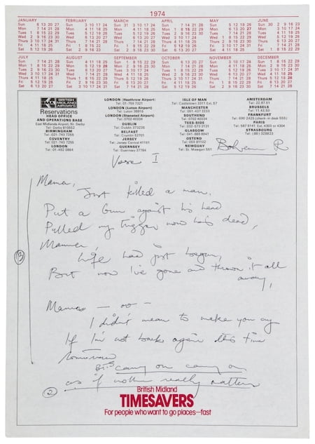 בתמונה: דף אחד מתוך הטיוטה של רפסודיה בוהמית שכתב פרדי מרקיורי.