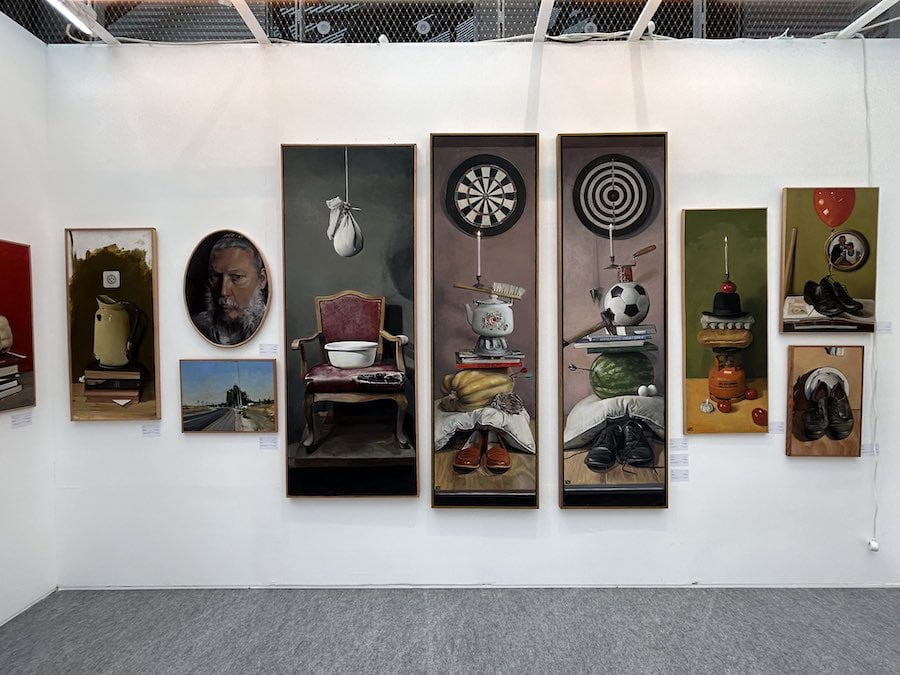 באיזור הגלריות והפרוייקטים, אני רוצה לציין את גלריה גורדון, שתומך ביריד מאז הקמתו ולא מוותר על השתתפות. יפה לראות בביתן הגדול של הגלריה אמנים ותיקים (שפעם היו מכונים דור הביניים), שהגלריה הציגה בימיו של מייסוד שעייה יריב. אמון, הדור הממשיך, נותן כמובן את הטון העכשווי אבל נותן הרבה כבוד למורשת הגלריה. מעניין לראות איך אדם יקותיאלי מהדהד את רפי לביא, למרות ההבדל הגדול בחומרים ובקונספט. לצד האוירה המונוכרמטית של גורדון, מוצג פרוייקט Africa First הצבעוני של איש האמנות סרז׳ תירוש, שחבר לאמון יריב לייצוג אמנים אפריקאיים – עוד טרנד שסוחף את עולם האמנות הגלובאלי. גם גלריה זימאק מציגה נבחרת מרשימה של אמנים. ההיילייט (שנעלם בינתיים) היא ציור של קהינדה וויילי, שבמבט ראשון תהיתי מי מעתיק אותו – בכל זאת יריד של אמנות ישראלית, ואז הסתבר לי שזה הוא עצמו. אז אולי מטעמי ביטוח או בטיחות, בביקור שלי אתמול ביריד, הציור נעלם.