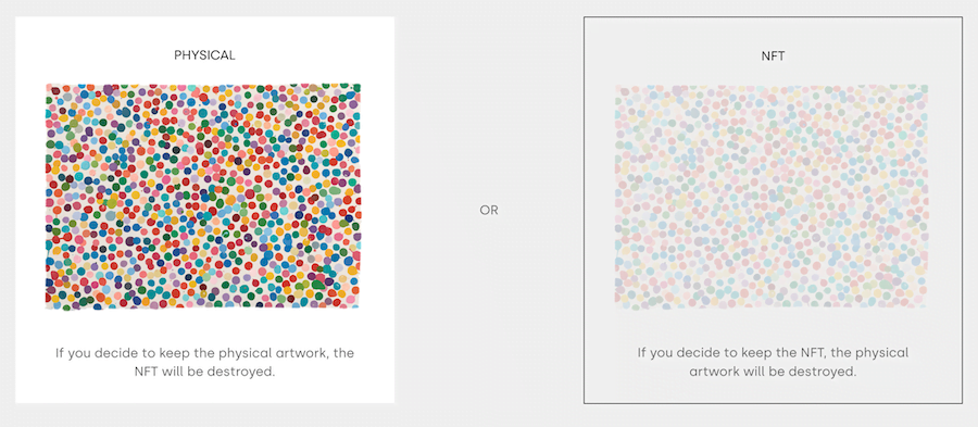 בעולם שבו יצירות אמנות נמכרות במיליוני דולרים ורוכשים רבים רואים ביצירת האמנות שרכשו עוד נכס בתיק ההשקעות שלהם, הירסט שם על השולחן (באופן ציני אך אמיתי) את מה שנמצא כבר מזמן באויר – אמנות הפכה למטבע בעלת ערך כספי משמעותי, כשהערך הכלכלי יותר דומיננטי בעת הנוכחית מהערך האמנותי. את זה אנחנו רואים במיוחד במרחב ה– NFT, אבל לא זה עיקר הפרוייקט של הירסט! כל עבודות הנייר הוכנסו לכספת והירסט יצר NFT – גירסה דיגיטלית ייחודית – של כל אחת מהעבודות. את ה– NFT’s הציע למכירה בסכום ממש זול – $2,000 כל אחד. חשבון פשוט: 10,000 קבצים = 20 מיליון דולר. כמובן שכולם נמכרו ואף היה עודף ביקוש. העניין הולך ונהיה מורכב יותר מפני כל רוכש נדרש להחליט תוך שנה מאז ההנפקה, האם הוא מעוניין לשמור את ה– NFT או להחליפו בעבודת הניייר. הדדליין להחלטה היה בתאריך 27.7.22.