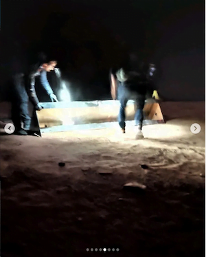 4 בחורים הגיחו מעבר לסלעים ו -2 מהם צעדו קדימה. הם דחפו את המונוליט כמה פעמים ואחד מהם אמר לי ‘אני מקווה שהישגת את התמונות שלך.’ אחר כך הוא נתן לעמוד דחיפה גדולה שהפיל אותו הצידה. הוא צעק בחזרה לחבריו האחרים שהם לא צריכים את הכלים. הבחור השני שהיה איתו אמר "זו הסיבה שלא משאירים אשפה במדבר." אז עלו ארבעתם ודחפו את האובייקט מצד לצד עד שהוא נעקר ונחת על האדמה במפץ עז. הם פרקו אותו במהירות, וכשנשאו את חלקיו אל המריצה שהביאו עימם, אחד מהם הביט לאחור על כולנו ואמר "אל תשאירו עקבות." השעה היתה 8:48.