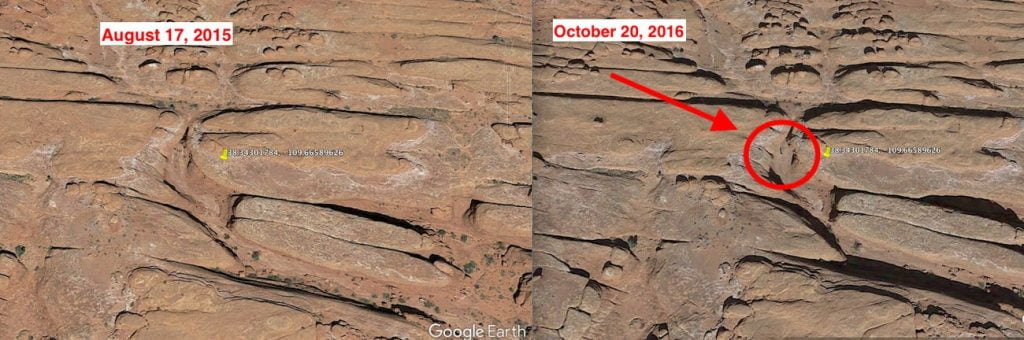בחיפוש אחרי נקודות אחיזה, פורסמו תמונות של גוגל Earth שמוכיחות, כביכול, שהמונוליט של יוטה הופיע ב– 2016. אחרי התבוננות בתמונות הרבות של המונוליט, לא השתכנעתי שהקו המסומן בעיגול במפה, הוא המונוליט וזאת מפני שבתמונות רואים בבירור שהוא נמצא בתוך נקיק ולא עומד במקום פתוח, כפי שמראה המפה. זה גם היופי של המונוליט הזה, שבהצבה שלו יש התייחסות אסתטית/אמנותית למיקומו בנוף. הרבה יותר מעניין מאשר סתם לשים עמוד על הר כמו שראינו ברומניה ובקליפורניה.
