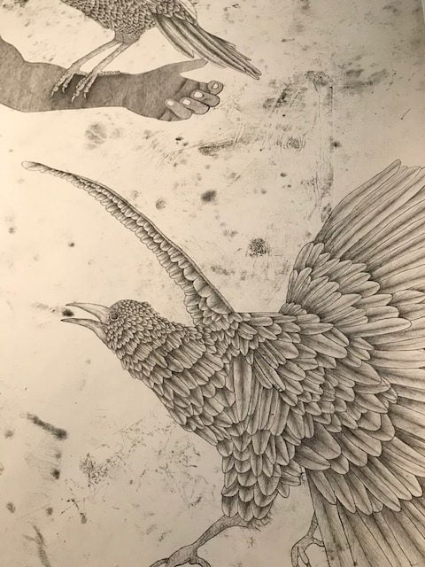 צביעת גליונות נייר בצבע שחור סמיך – דיו על בסיס שמן, חיבורם ליריעה אחת גדולה המונחת על גבי הנייר הלבן. הם מתפקדים כנייר קופי שתפקידו להעביר את קווי המתאר של הדמויות. הכתמים שנוצרו על העבודות הם תוצר של הישענותה על העבודה עם היד / הרגל (היא עובדת על הרצפה) יש מקומות שממש ניתן לזהות אברי גוף. לאחר השלב הזה היא עובדת על הדמויות עצמן, העופות והנחשים – וממלאה את הכל בטקסטורות בעט מאוד מאוד דק – תהליך עמלני שדורש סבלנות וזמן. אולי, בדומה לעבודה הרפטטיבית של יאיוי קוסאמה, חוויית היצירה הופכת מדיטטיבית, כמעט דתית.